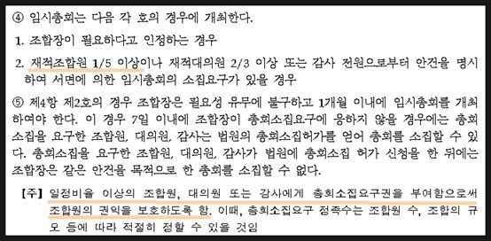 국토부 지주택 표준규약에 따르면 재적조합원 1/5 이상의 소집요구를 통해 임시총회를 개최할 수 있는데요(조합 정관에 따라 조금씩 다를 수 있습니다).