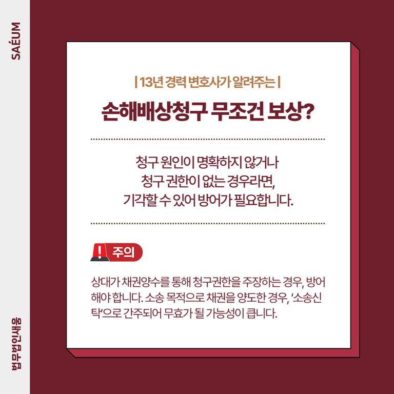 상대방이 피해를 입거나 손실을 주장한다고 해서 무조건 보상을 해야 하는 것은 아닙니다. 청구 원인이 명확하지 않거나, 청구권한이 없는 경우라면 이를 거부할 수 있습니다.