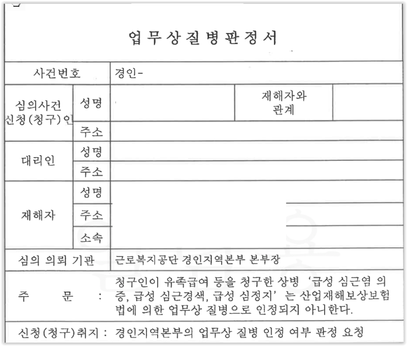 업무상 사고로 산재를 신청하는 것과 달리, 뇌심혈관질환·근골격계질환·정신질환·직업성 암 등 업무상 질병으로 산재를 신청한다면 업무상 질병판정위원회를 거치게 되어 있습니다.