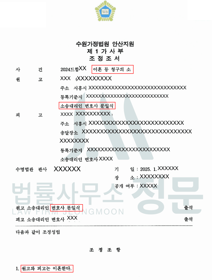 적극적인 조정 전략 덕분에 법원은 조정 기일을 조속히 잡아주었고, 결국 첫 조정기일에 당사자 간 합의가 성립되었습니다. 이에 추가적인 소송절차의 진행 없이 조정으로 이혼이 확정되었고, 예상보다 훨씬 빠르게 의뢰인은 혼인 관계를 정리할 수 있었습니다.