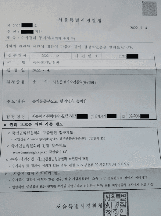 혐의없음(증거불충분) 처분을 받았습니다. 아동관련 사건은 혐의가 없어도 검찰에 송치하도록 되어 있습니다. 혐의없음으로 검찰에 송치된 사안이었습니다.