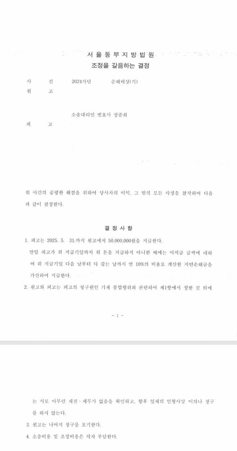 재판부 역시 피해자의 피해정도가 심각함을 인정하여 강제조정을 권고하였고, 그 결과 5,000만원의 손해배상액을 지급하라는 결정이 내려졌습니다.