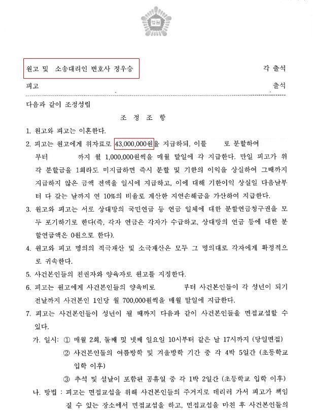 그리하여 의뢰인 분과 상의 끝에 위자료를 분할해서 지급하는 대신 총액 4,300만원을 지급할 것을 상대측에 요청하였고, 1회라도 이를 어길 시 일시금으로 지급해야 한다는 기한이익 상실 조항을 추가하였습니다.
