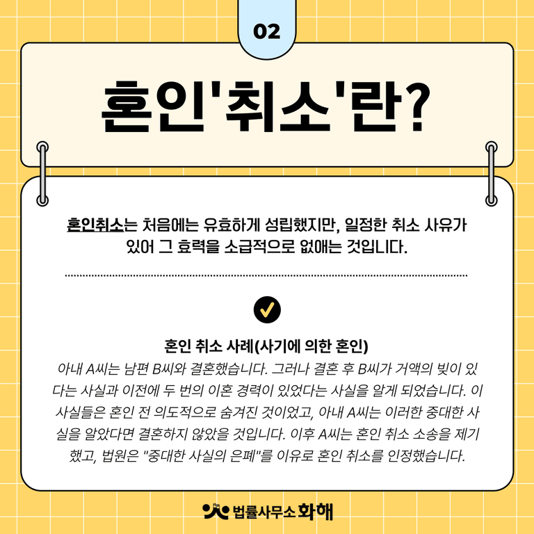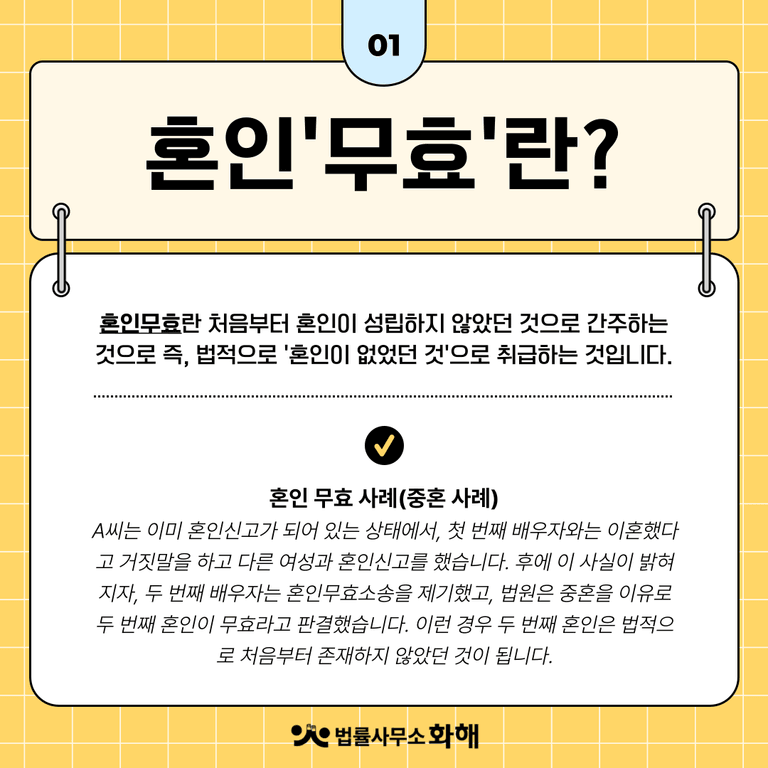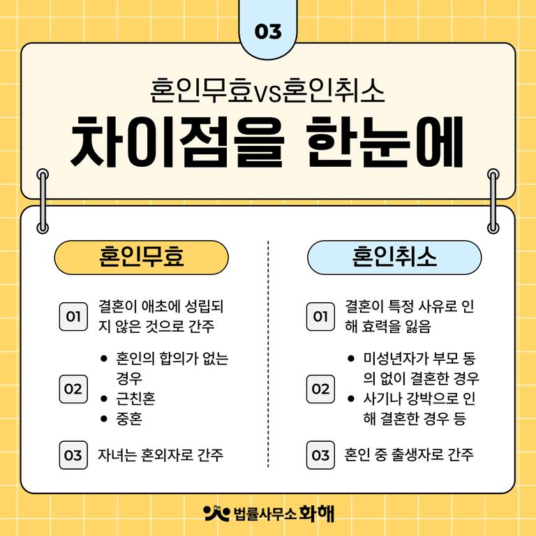 여러분은 ‘혼인 무효’와 ‘혼인 취소’라는 제도를 알고 계신 가요? ‘무효’와 ‘취소’라는 개념 자체가 비슷해 보여서 두 제도를 많이들 헷갈려 하시는데요. 둘은 엄연히 다른 제도이기에, 오늘은 '혼인 무효'와 '혼인 취소'의 차이점에 대해 알아보려고 합니다. 두 개념 모두 결혼의 법적 효력을 없애는 제도이지만, 그 요건과 효과에는 중요한 차이가 있기 때문에 법률사무소 화해와 함께 보다 자세히 살펴보겠습니다.