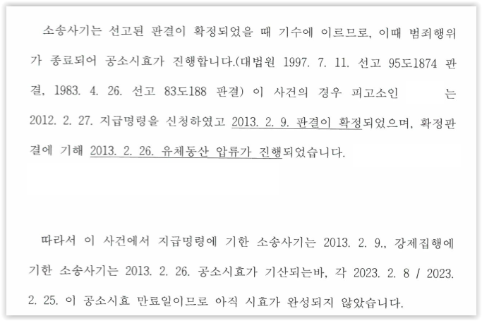 핵심은 아직 어느정도 시간이 있다면 경찰, 검찰의 신속한 수사를 통해 시효 완성 전 공소제기 결정을 받는 것이고, 최후의 수단으로 시효 완성 30일 전에는 재정신청서를 접수하는 것입니다. 참고하시기 바랍니다.