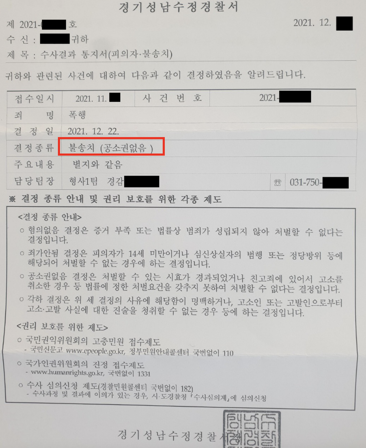 공소권 없음 처분! 의뢰인은 상대방과 무난히 합의를 하였습니다. 적정한 수준의 합의금을 제시하여 합의를 원활하게 할 수 있었습니다. 폭행은 반의사불벌죄로 합의를 하면 공소권없음 처분을 받습니다. 합의가 무엇보다 중요하지만, 합의금 책정도 무엇보다 중요합니다.