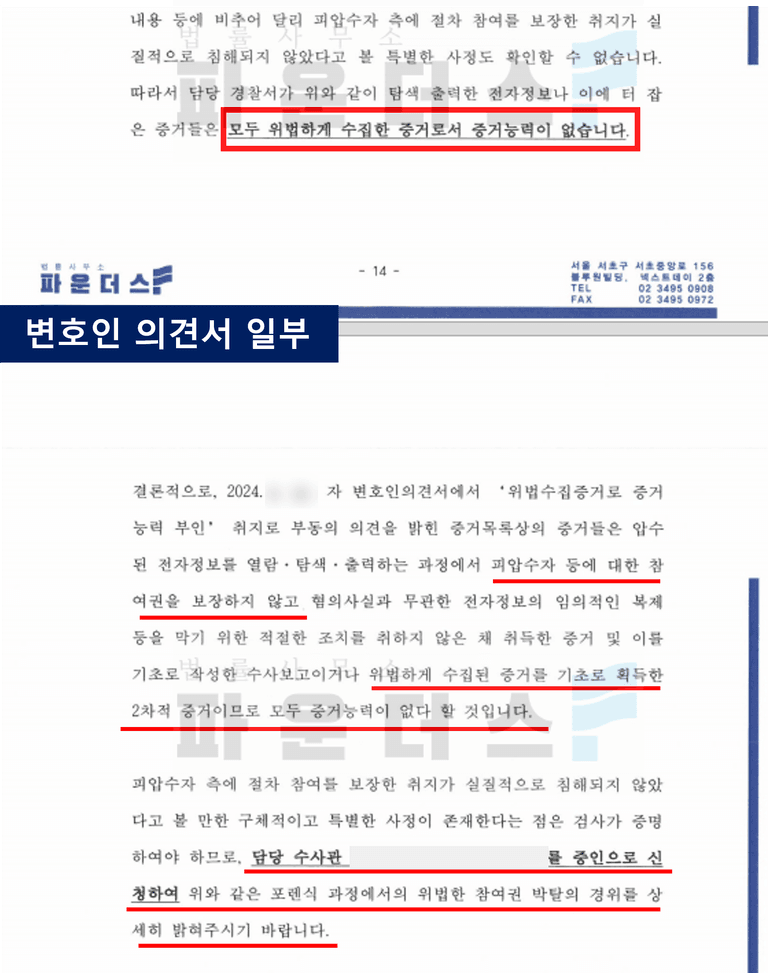 변호인은 변호인의견서 작성을 통해 앞선 압수수색 절차를 통해 출력된 증거들은 모두 위법한 방법으로 수집된 것으로 증거능력이 없음을 주장하였고, 이 점을 입증하기 위해 담당 수사관과 이전 사건 담당 변호사를 증인으로 신청하였습니다.