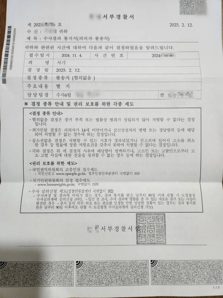 그 결과 경찰은 다음과 같은 이유로 "혐의 없음" 불송치 결정을 하였습니다.