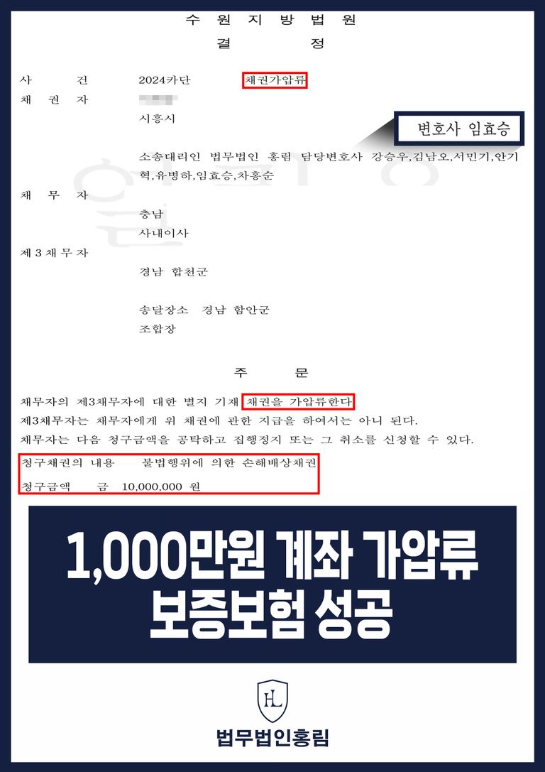 그 결과 법원에서는 본 변호인의 주장을 받아들여 통장 가압류(전액 보증보험)하였습니다.