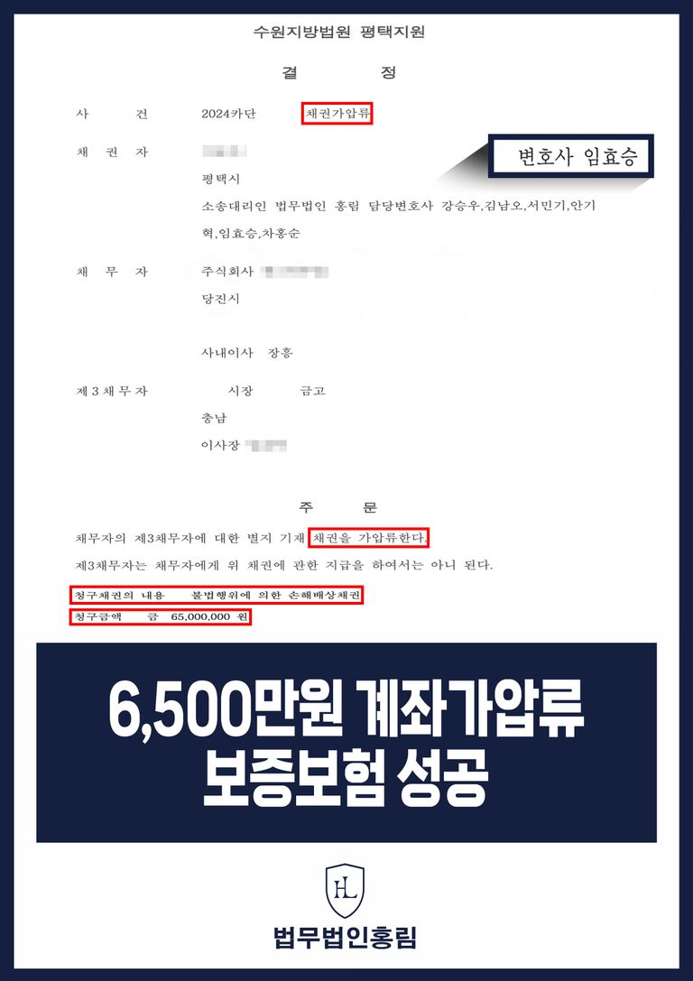 그 결과 법원에서는 본 변호인의 주장을 받아들여 통장 가압류(전액 보증보험)하였습니다.