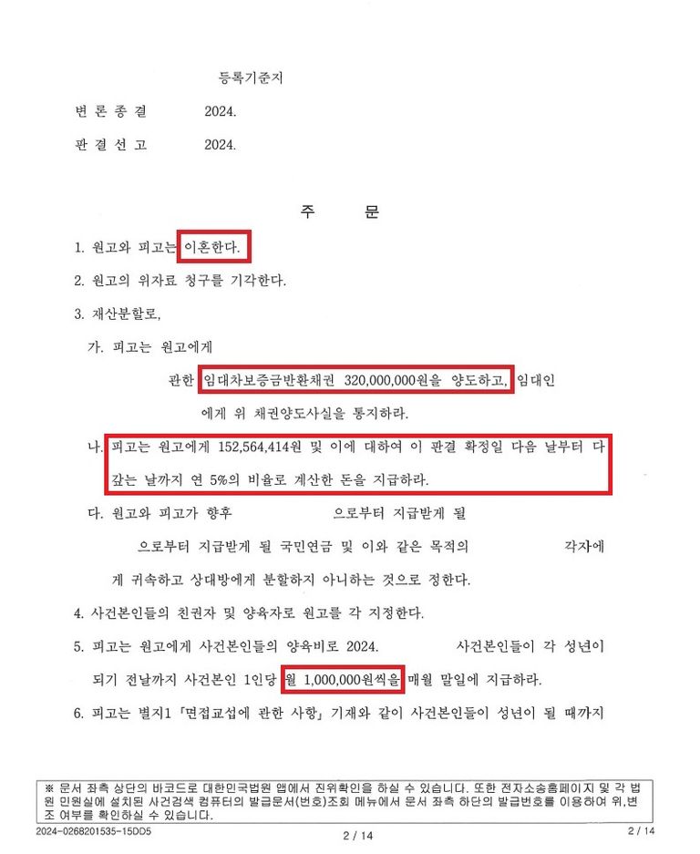 양육비로 1인당 1백만 원을 지급하라는 판결을 하였습니다.