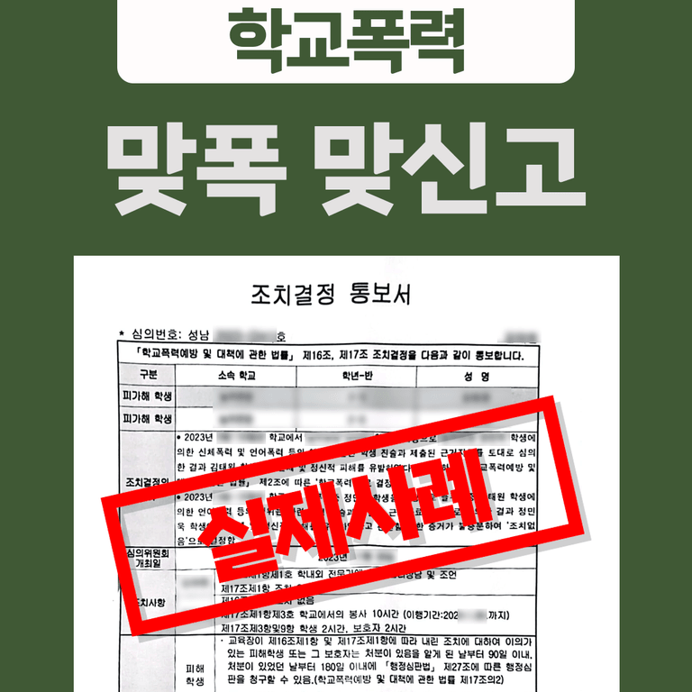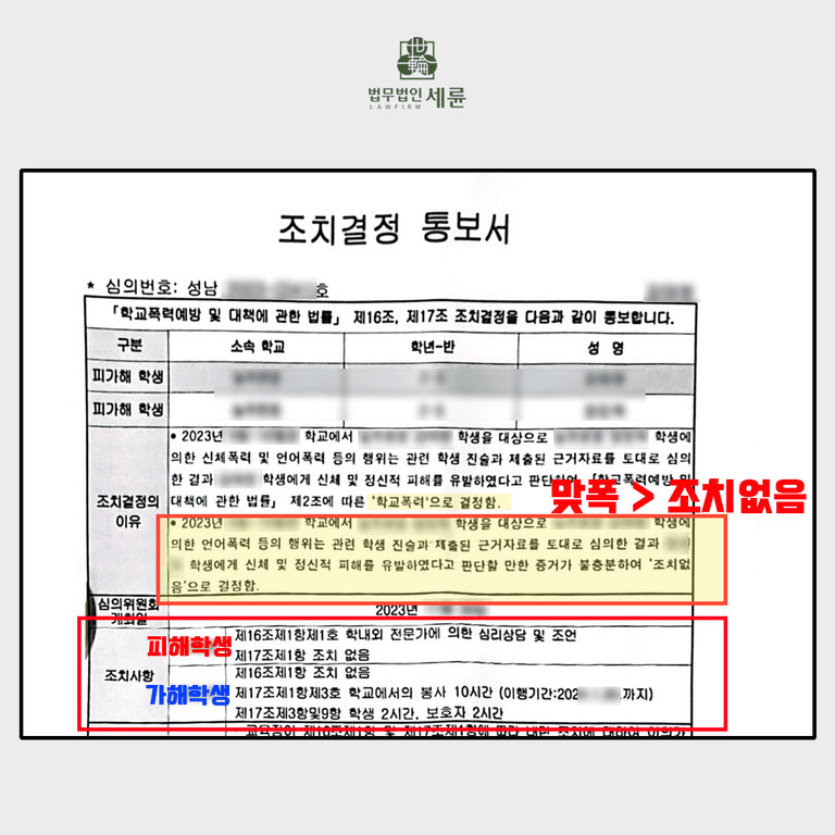 결과적으로 맞폭으로 역신고를 당하여 마음고생을 해야했던 의뢰인 A는 심의위원회에서 세륜의 조력을 통해 피해학생 A는 누명을 벗고 , 가해학생은 3호 처분을 받게 되었습니다.