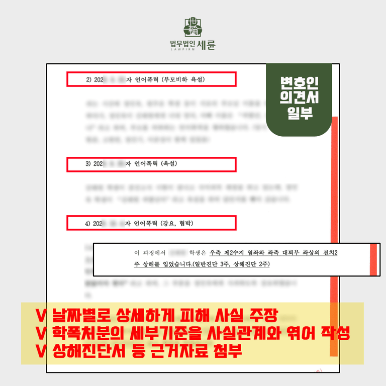 저희 세륜은 변호인의견서를 통해 날짜별로 상세하게 피해 사실을 주장하고 학폭처분의 세부기준을 사실관계와 엮어 작성하합니다. 물론 이를 뒷받침하는 상해진단서와 친구들의 의견 진술서도 함께 첨부했지요.