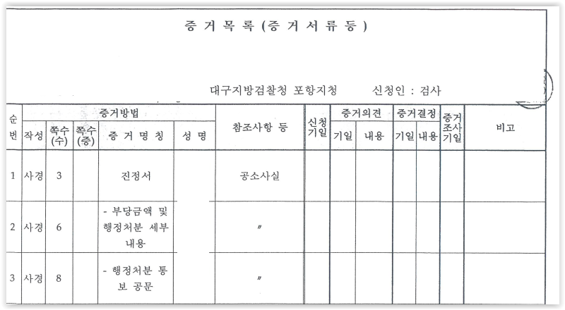 즉, 검사는 수사기록 전부의 목록이 있는 '수사목록'을 법원에 제출하는 것이 아니라, '수사목록' 중 범죄를 입증하는데 유리한 일부 자료를 추린 '증거목록'만을 법원에 제출하는 것입니다.