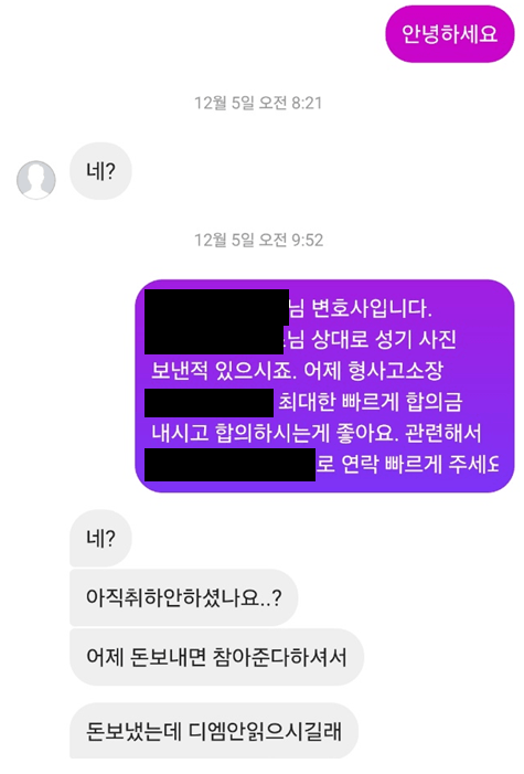 해당 계정의 사용자가 성적인 욕설과 함께 자신의 성기 사진을 전송했던 것입니다. A는 너무 놀라고 당황하여 즉시 메시지를 차단하려고 했지만, 곧바로 법적인 대응이 필요하다고 판단하고 저에게 상담을 요청하였습니다.