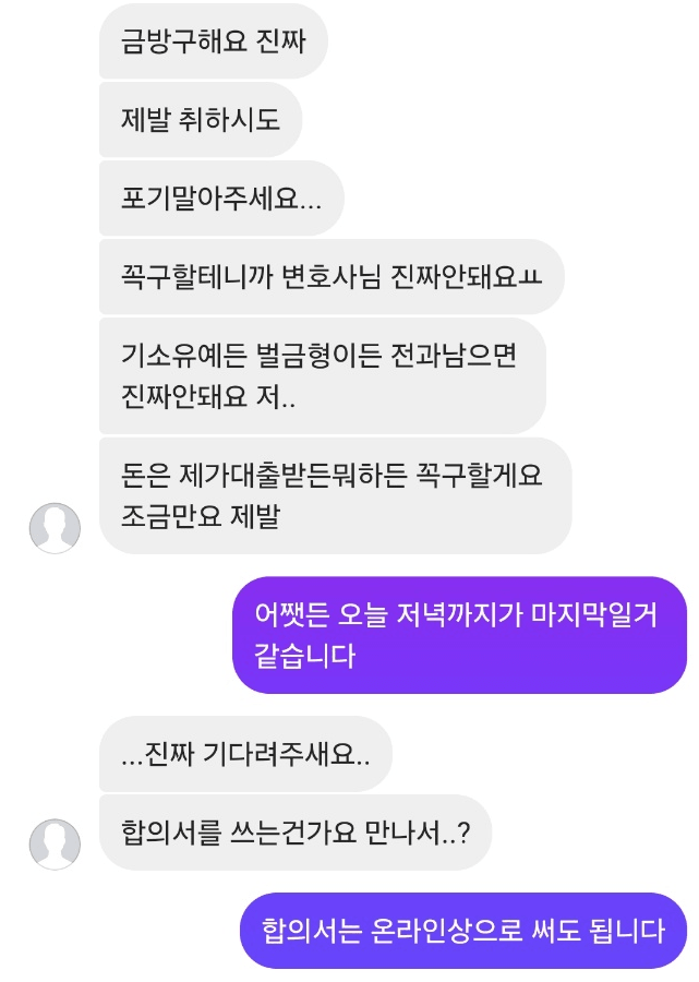 이 모든 것은 피해자이자 제 의뢰인의 이익을 위해서이며, 금전적인 보상이 전부는 아니지만 그나마 제 의뢰인을 위로할 수 있기 때문이죠. 물론 그 중 일부는 제 성공보수로 받기도 하니 저는 악착같이 합의금을 받아내려고 합니다.