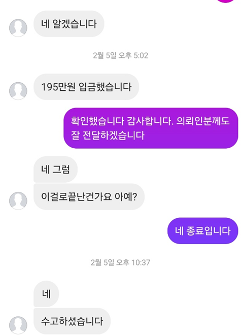 다행히 이 남성은 약속한 날짜 다음날에 합의금액 200만원 중 맨 처음에 지급한 5만원을 제외한 195만원을 송금하였습니다.