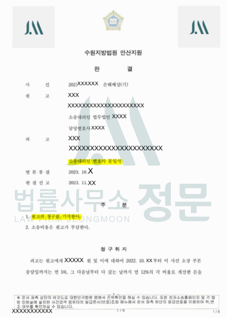 그 결과 상대측의 청구가 전부 기각되고, 패소자 부담의 원칙에 따라 소송비용 또한 상대측에서 모두 부담하게 되는 성공적인 결과를 만들어 낼 수 있었던 사례였습니다.