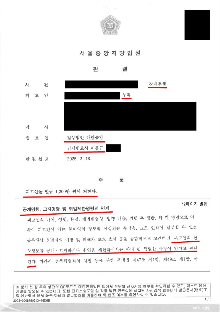 그 결과 재판부는 이동규 변호사의 주장을 인정하여 징역이 아닌 벌금형을 선고하고, 신상공개 및 취업제한명령은 선고하지 않았습니다.