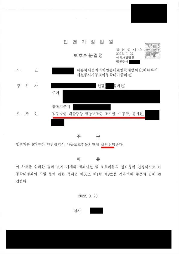 결과적으로 사건은 형사사건이 아닌 아동보호사건으로 진행되어 취업제한을 받지 않을 수 있었고, 아동보호전문기관 상담위탁이라는 가벼운 처분으로 사건을 마무리할 수 있었습니다. 그리고 아동보호재판에서 의뢰인에게 유리하게 고려된 점이 두루 참작되어 의뢰인과 의뢰인이 재직 중인 어린이집 모두 행정처분을 받지 않을 수 있었습니다.