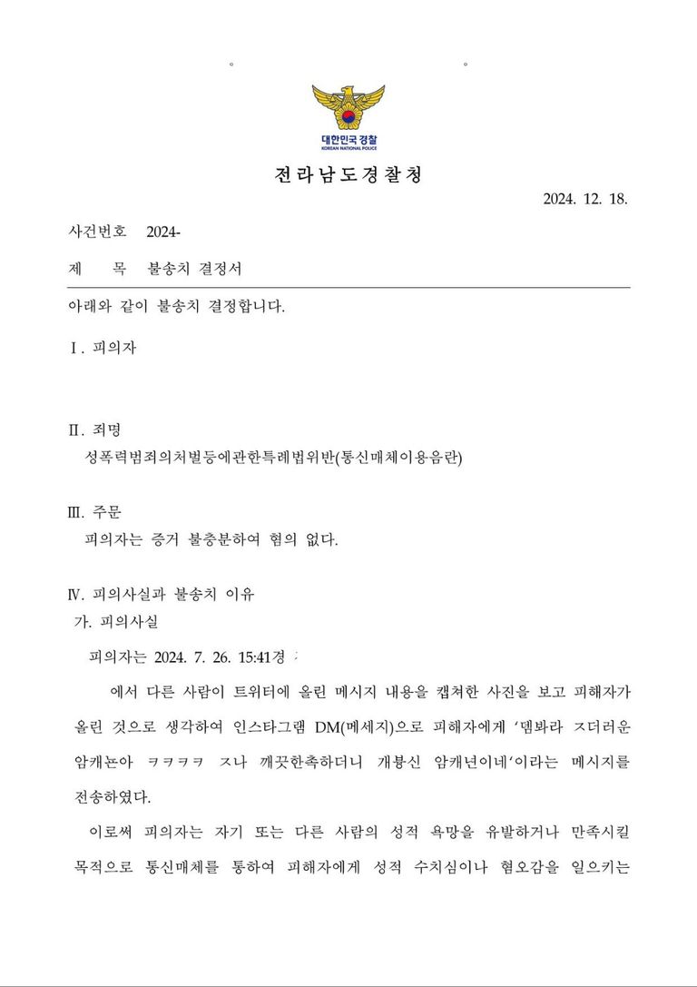 이에 피의자는 피해자가 소위 말하는 섹트의 운영자로서 본인을 능욕해 달라고 공개게시글을 작성한 것으로 오해하여 피해자에게 인스타 디엠으로 "ㅈ 더러운 암캐뇬아 ㅋㅋㅋㅋ ㅈ나 깨끗한척 하더니 개븅신 암캐년이네"라는 메세지를 전송하게 되었습니다.
