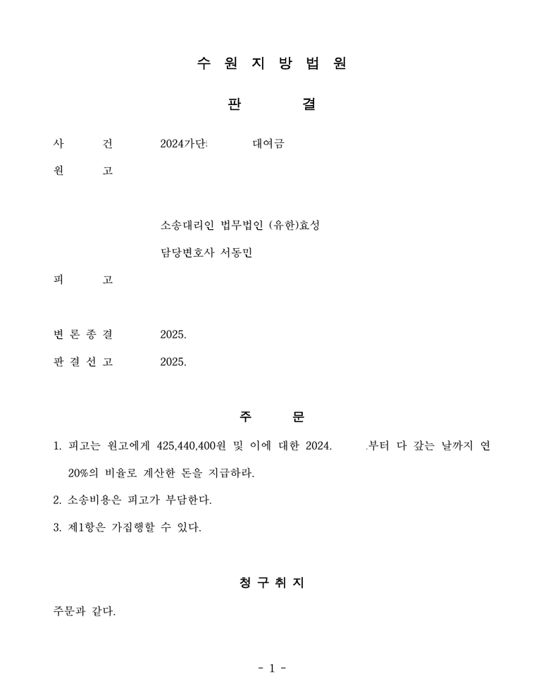 저는 즉각 민사소송 대여금청구를 하여 대여사실을 기타 증거(문자, 카톡, 통화녹음 등)로 주장 입증하였고 법원은 원고 승소 판결을 선고하여 의뢰인을 대여금을 변제받았습니다.