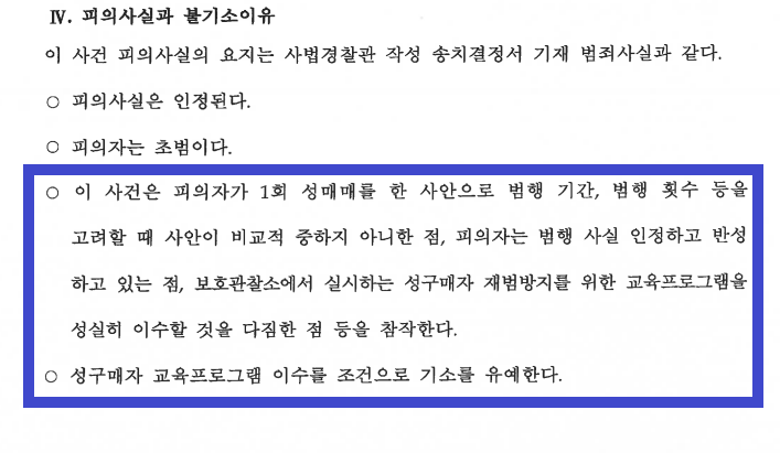 결국 이러한 주장을 받아들여, 검사는 일반 성매매 혐의만 인정하여 A씨에게 '기소유예' 처분을 내렸습니다.