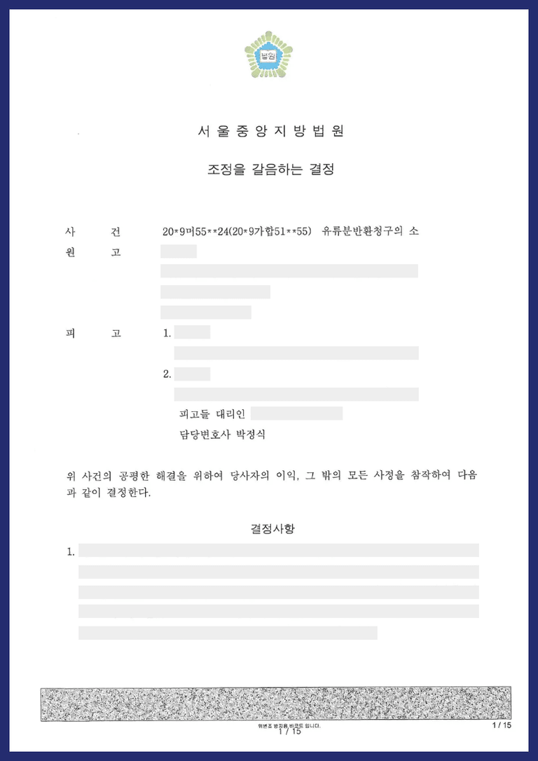 ③ 유류분반환청구소송에서 피상속인의 적극재산이 남아 있고, 그러한 적극재산을 먼저 분할하여야 하므로, 남아 있는 적극재산을 법정상속분대로 분할하고, 피고들이 원고에게 유류분을 가액으로 반환하도록 하는 조정을 갈음하는 결정이 난 사안입니다.