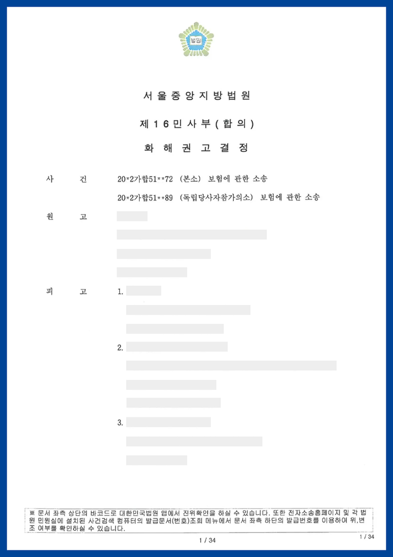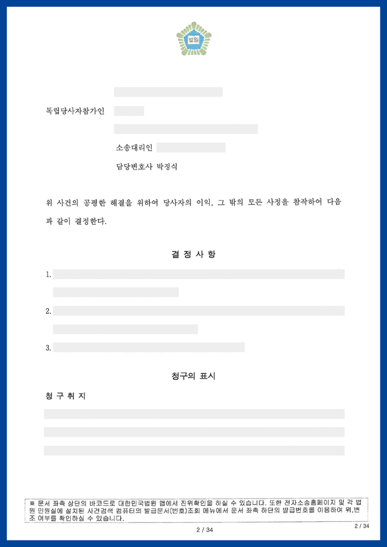 결국 이러한 독립당사자참가인의 주장이 받아들여져 재판부의 권유에 따라 화해권고결정이 내려졌고 당사자들이 이의하지 않아 확정되었습니다.