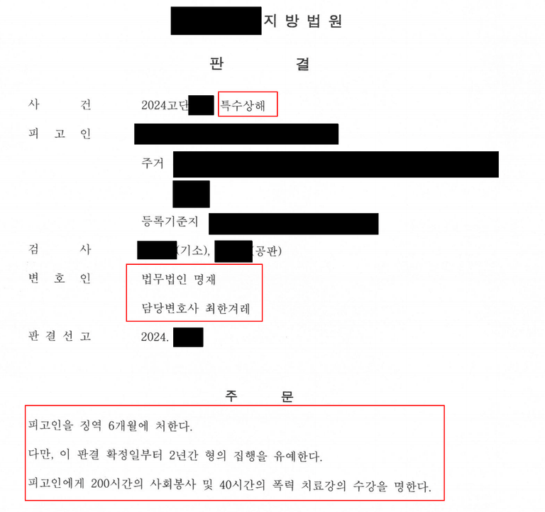 징역 6개월, 집행유예 3년, 200시간 사회봉사 및 40시간의 폭력 치료강의 수강