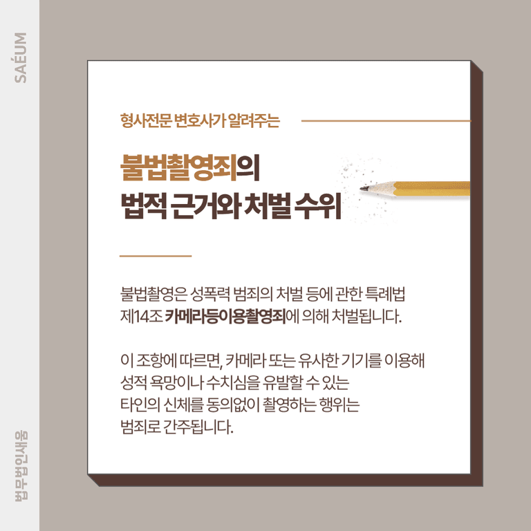 만일 본인이 불법촬영 혐의로 수사를 받고 있거나, 관련 사건에 연루되었다면 신속한 대응이 필요합니다. 오늘은 불법촬영 연루 시 적용되는 법적 근거와 대응 방법에 대해 알아보겠습니다. 법적 도움이 필요하다면, 형사전문변호사의 조력을 받아 보다 효과적인 해결책을 모색하시기 바랍니다.