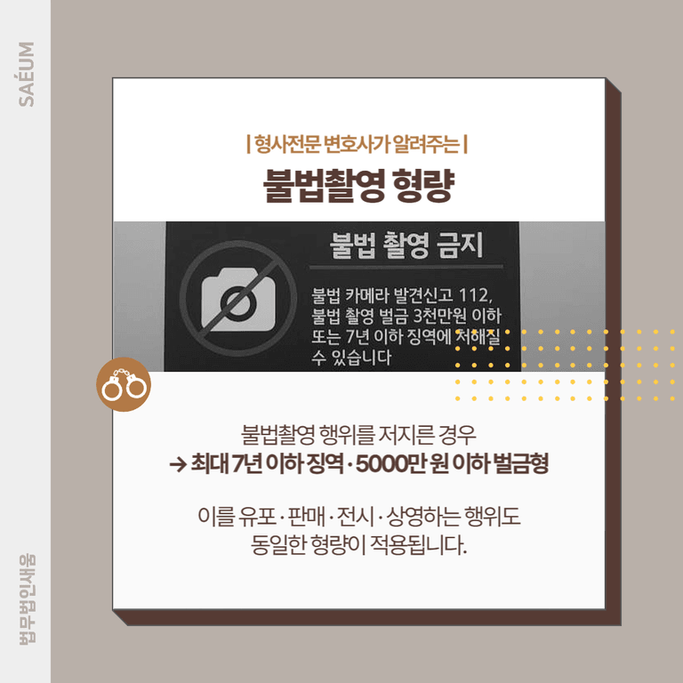 이러한 행위를 저지른 경우, 최대 7년 이하의 징역 또는 5,000만 원 이하의 벌금형을 받을 수 있습니다. 또한, 불법 촬영물을 유포, 판매, 전시, 상영하는 행위도 동일한 형량이 적용됩니다.