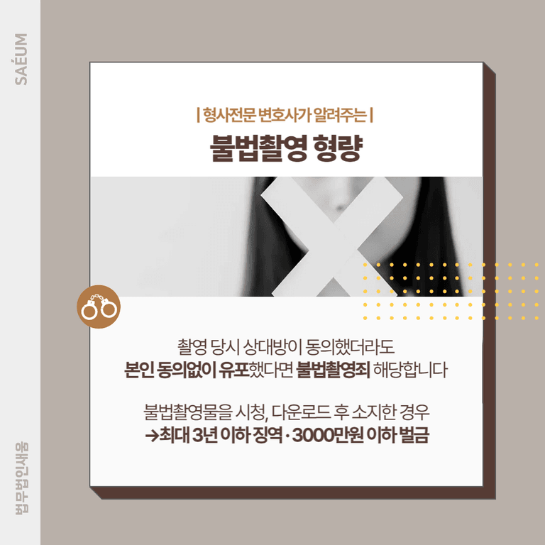 촬영 당시 상대방이 동의했다고 하더라도, 이후 본인 동의 없이 유포했다면 불법촬영죄에 해당하며 처벌을 피할 수 없습니다. 또한, 단순히 불법 촬영물을 다운로드하거나 소지, 시청한 경우에도 처벌 대상이 됩니다. 이 경우 최대 3년 이하의 징역 또는 3,000만 원 이하의 벌금형이 부과됩니다.