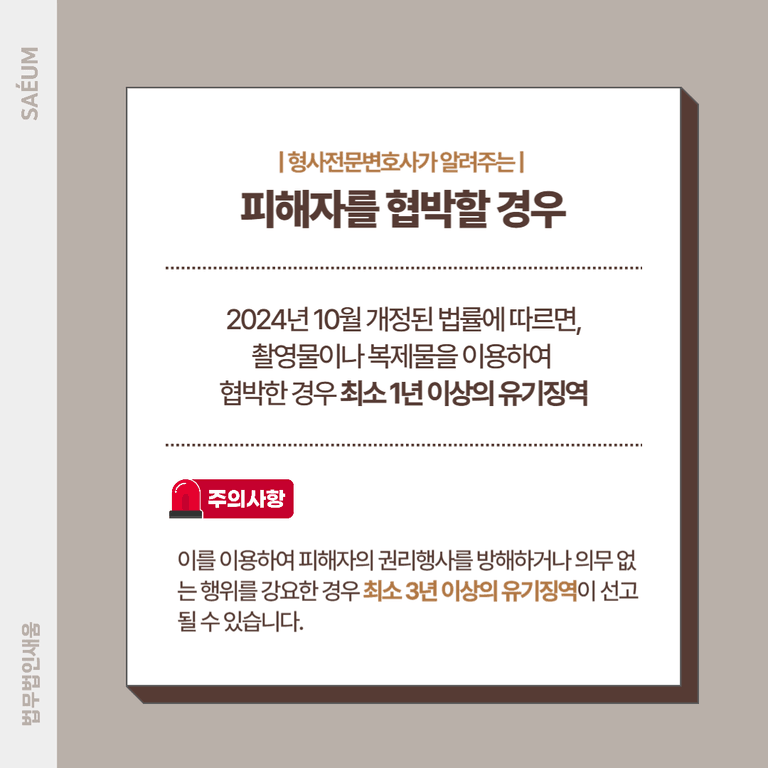 2024년 10월 개정된 법률에 따르면, 촬영물이나 복제물을 이용하여 협박한 경우 최소 1년 이상의 유기징역에 처해집니다. 또한, 이를 이용하여 피해자의 권리행사를 방해하거나 의무 없는 행위를 강요한 경우 최소 3년 이상의 유기징역이 선고될 수 있습니다.