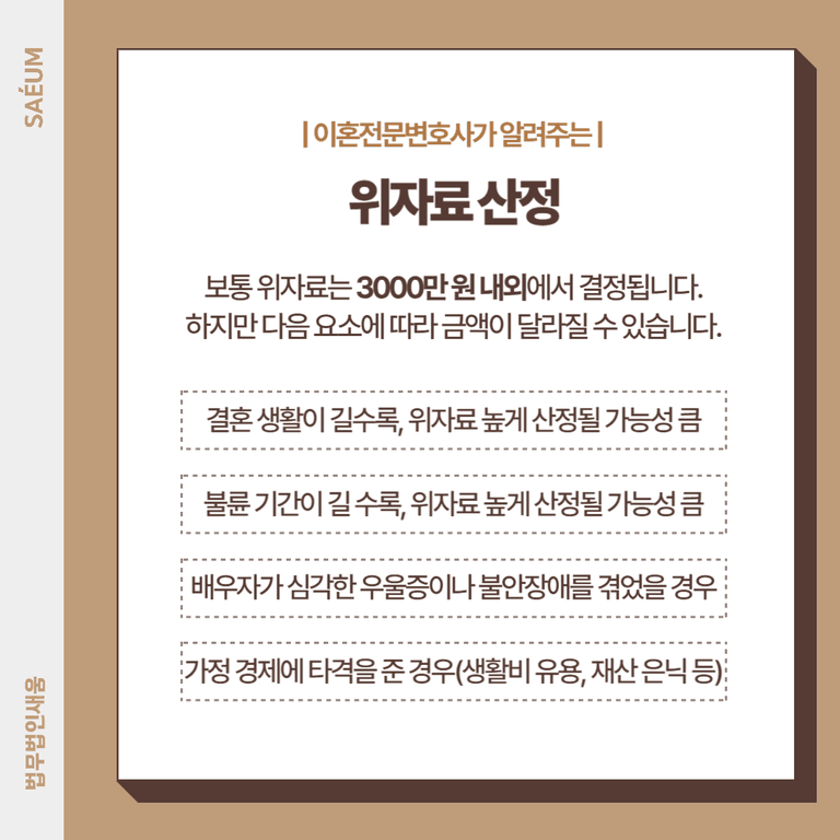 일반적으로 위자료 금액은 3,000만 원 내외에서 결정되는 경우가 많습니다. 하지만 다음과 같은 요소에 따라 금액이 달라질 수 있습니다.
