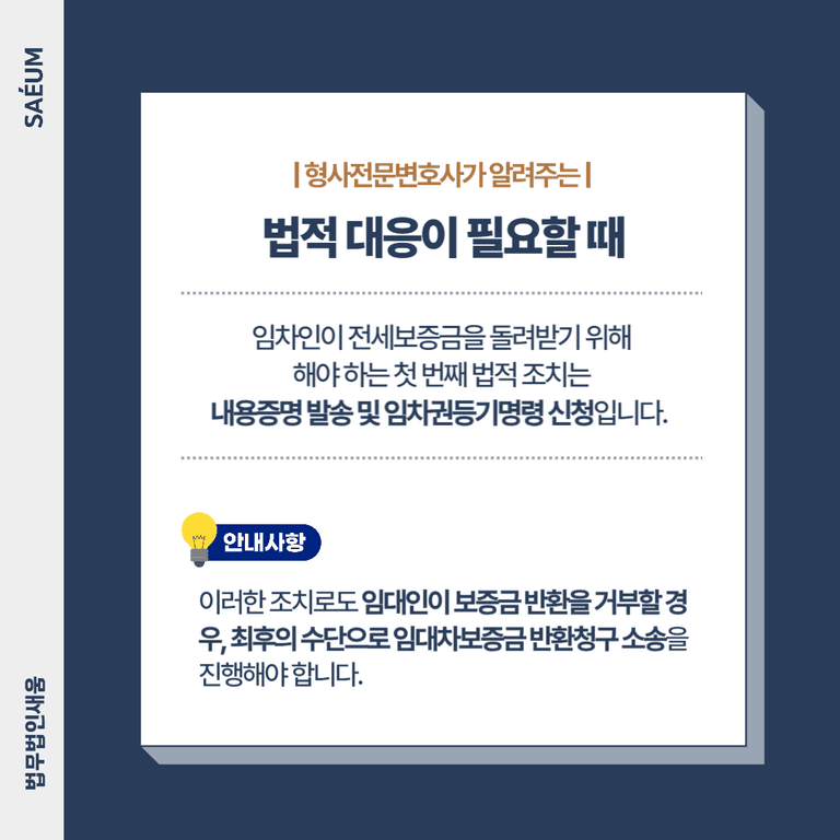 이사 일정이 촉박하거나, 부동산을 구입하기 위해 반드시 보증금을 돌려받아야 하는 상황에서 집주인이 반환을 미루면 상당한 경제적·정신적 피해를 입을 수 있습니다. 따라서 전세사기 피해를 최소화하고, 임대차보증금을 신속하게 돌려받을 수 있는 법적 대응 방법을 정확히 아는 것이 중요합니다.