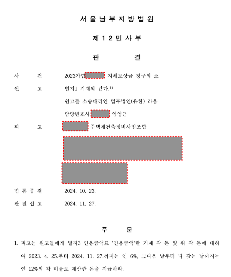 23년 5월부터 진행하였던 신o동 ooo 아파트 입주지연 손해배상청구 단체소송이 작년 말 전부 승소(정확히는 99.9999% 승소) 판결(서울남부지방법원 2023가합1036**)이 확정되었습니다.