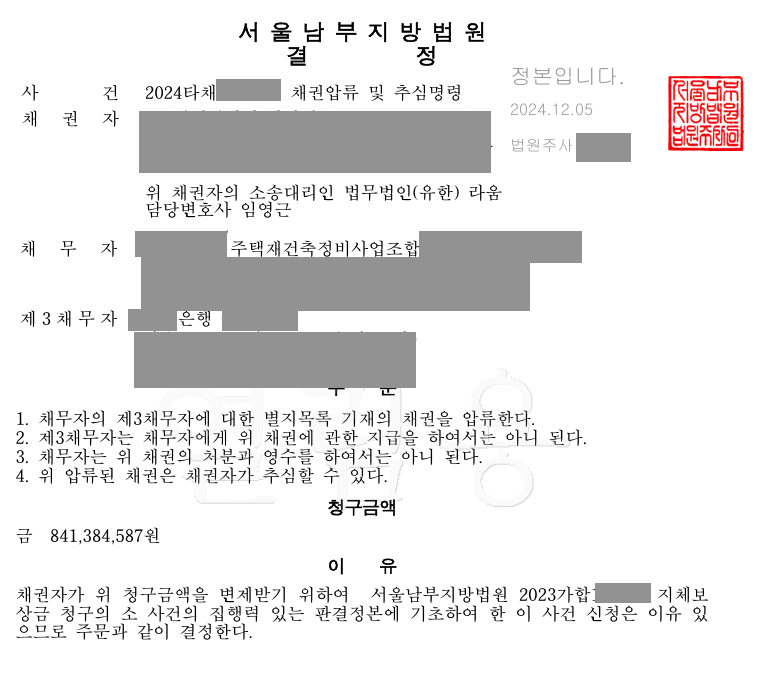 더욱 중요한 시점은 판결이 선고된 이후부터입니다! 1심 판결이 선고되자마자 바로 조합계좌 압류를 진행했습니다. 그런데 빙고!~ 상당한 자금이 들어 있었고 배당절차가 진행되면서 압류 경합 없이 이를 확보하였습니다. 결국 조합과 협상으로 나머지 돈도 확보를 하게 되었습니다.^^