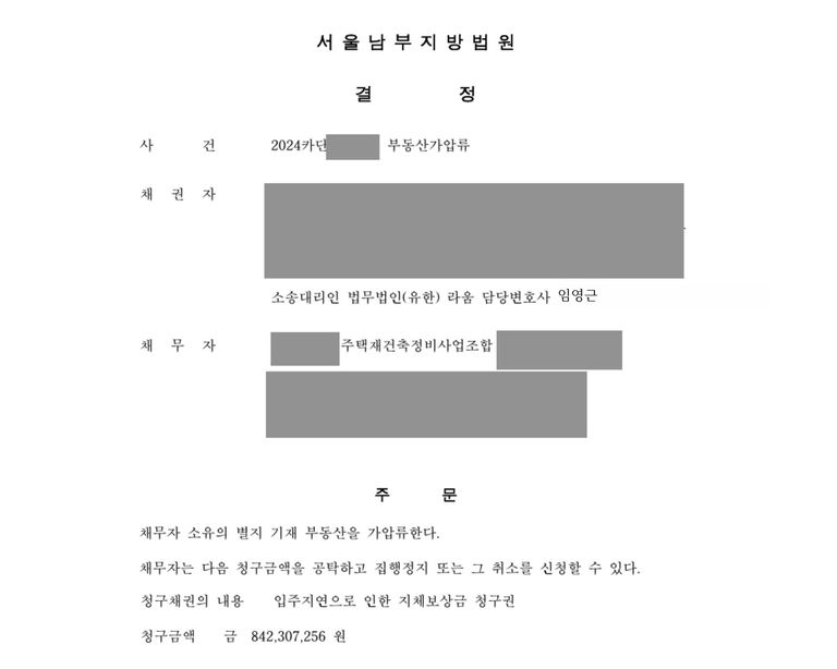 상대 조합은 시공사 공사비 관련 법적 분쟁을 벌이고 있었고 상가는 대부분 미분양인 상황으로 재정 상황이 좋지 않았으며 자칫하면 승소판결을 받아도 시공사의 막대한 공사비채권과 경합이 되거나 돈을 받지 못할 위험이 있었습니다. 보전처분 중 가장 부담이 적고 확실한 부동산 가압류를 진행하기 위해서 조합의 상황을 예의주시하였고, 상가 보존등기가 나오자 마자 부동산가압류를 진행하였습니다.