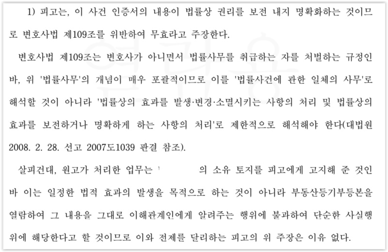 특히 대법원은 "단순히 등기부등본을 확인하여 등기부상 권리관계의 내용을 조사하거나 그 내용을 보고서에 기재하는 행위는 변호사법 위반이 아니다."고 판시하였는바, (대법원 2008. 2. 28. 선고 2007도1039 판결)