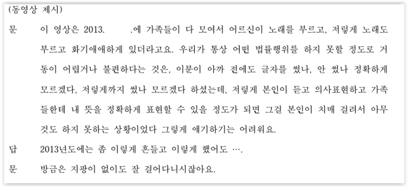 또한 김숙자는 父 이중기 명의의 확인서가 작성된 2013. 경, 이중기의 치매가 심하고 거동이 여의치 않아 자신이 이중기와 함께 외출, 돈관리등을 모두 하였으며, 이중기는 확인서를 작성한 적이 없다고 증언하였습니다.