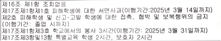 위와 같은 노력의 결과 학폭위에서 법률사무소 새율이 주장한 사실관계가 그대로 인정되었습니다. 가해자의 학폭신고 내용 대부분이 허위내용으로 인정되어 의뢰인은 대부분 '조치없음' 처분을 받았고, 가해자는 1, 2, 3호 처분을 받게 되었습니다.