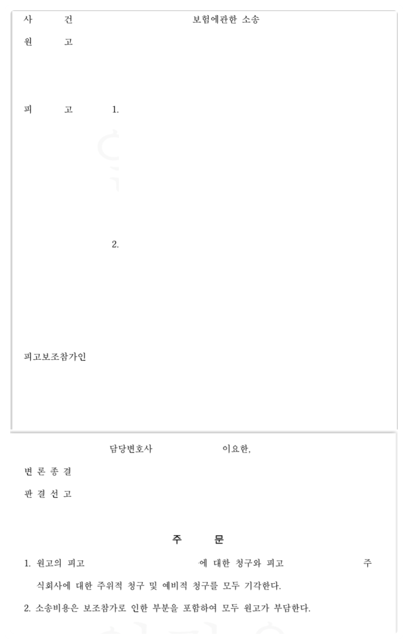 의뢰인은 보험금 소송의 당사자인 원·피고는 아니었습니다. 그러나 보험사(피고)가 패소할 경우 이미 지급받은 보험금을 토해낼 수 있었으므로, 위 소송에 보조참가인으로 참여하여 원고 주장을 반박하였습니다.
