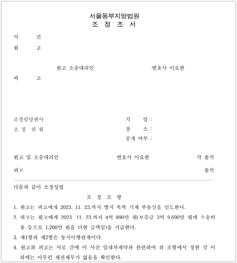 양 측이 모두 참석한 조정기일에서, 피고에게 보증금은 물론 의뢰인이 지출한 소송비용까지 전부 부담해야 함을 강조하였습니다. 결국 피고와 의뢰인은 임대차 계약 관계를 상호 합의 하 종료하고, 피고가 의뢰인의 보증금과 소송비용 전액을 부담하는 내용으로 합의하여 사건은 조정으로 종결되었습니다.