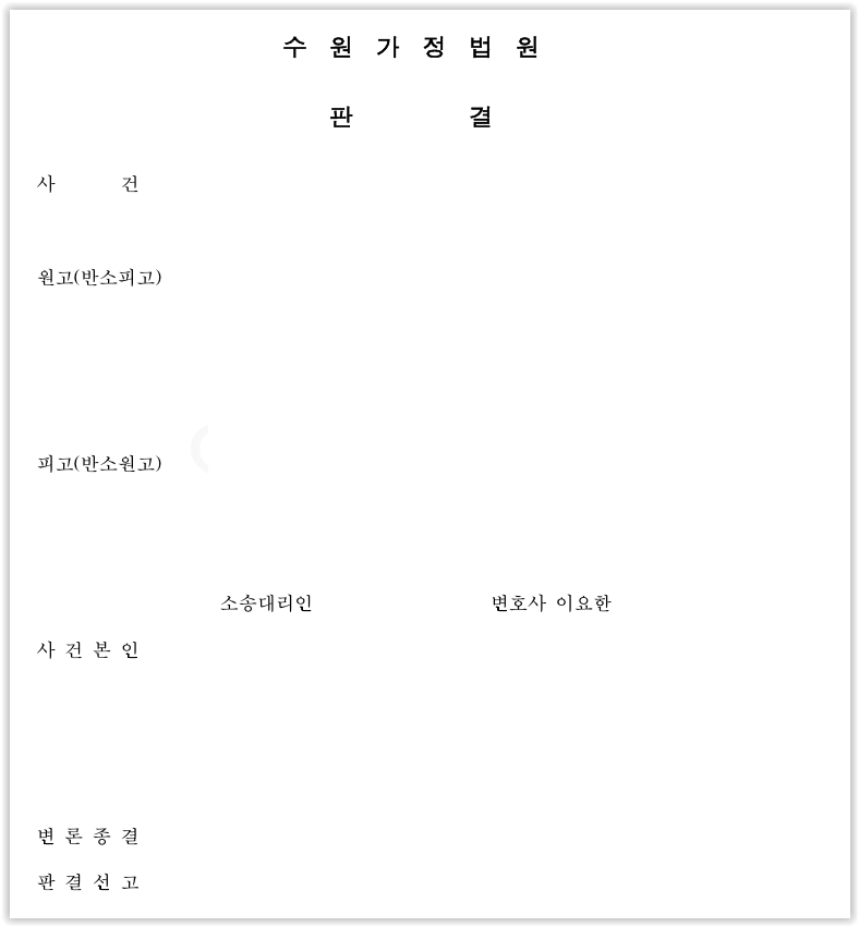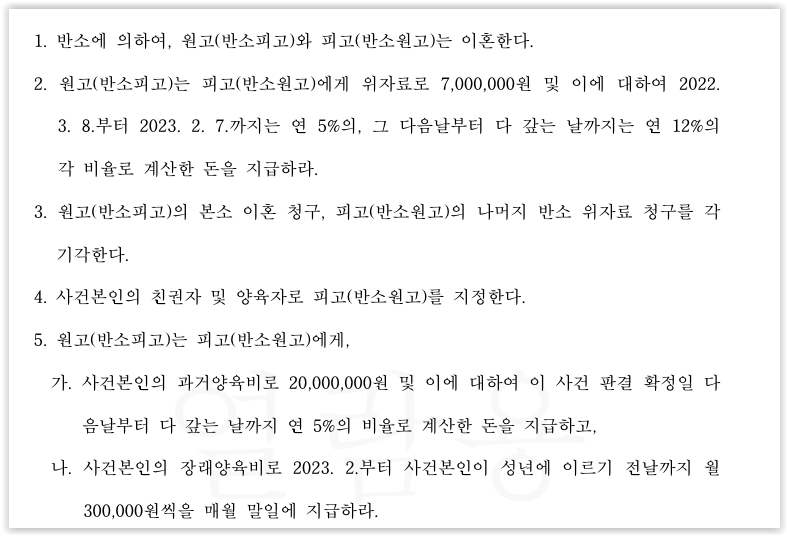 재판부에서는 저의 주장을 받아들여 이혼 및 위자료, 양육비 청구를 모두 인용하였고, 사건본인의 친권자 및 양육자로 피고를 지정하였습니다.