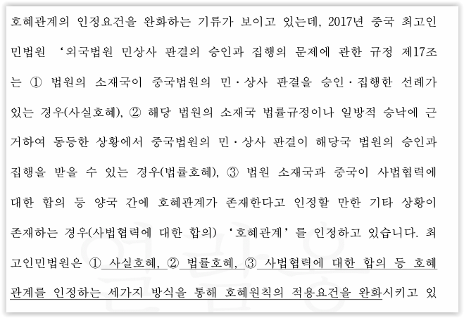 이에 중국 민사소송법 제281조, 제282조, 민사소송법 사법해석, '이혼승인 특별규정'을 참고하여 중국법원이 외국판결을 승인·집행하는 요건을 확인하였습니다. 그리고 이 사건의 경우 요건을 모두 충족하므로 대한민국 법원 판결의 효력이 중국에서 인정될 것이라고 주장하였습니다.