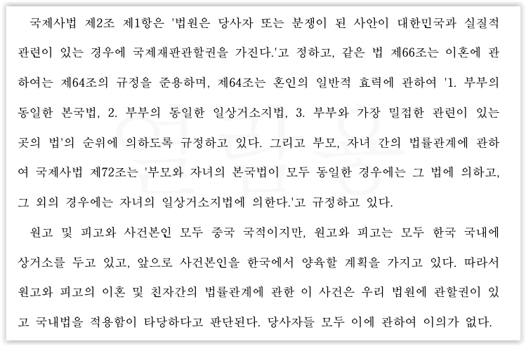 대한민국 법원의 판단을 받지 못할 경우 중국 법원에서 양육비 재판을 받아야 하는데, 현재 대한민국에 거주중인 원·피고가 중국 법원에서 판단을 받는 것은 심히 불편한 점 등을 주장하였습니다.