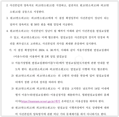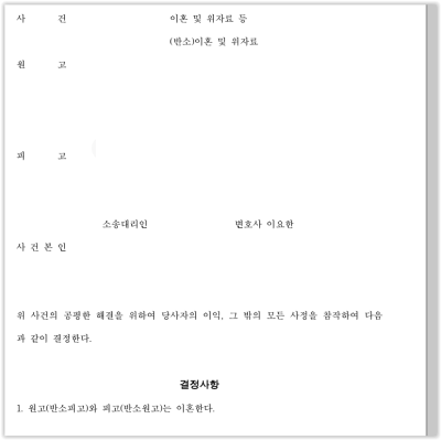 재판부에서는 ① 원고와 피고가 이혼하고 ② 아이의 양육자로 피고를 지정하며, ③ 원고가 매월 피고에게 양육비를 지급하는 내용의 화해권고결정을 내렸고, 양자가 이의하지 않아 화해권고결정이 확정되었습니다.