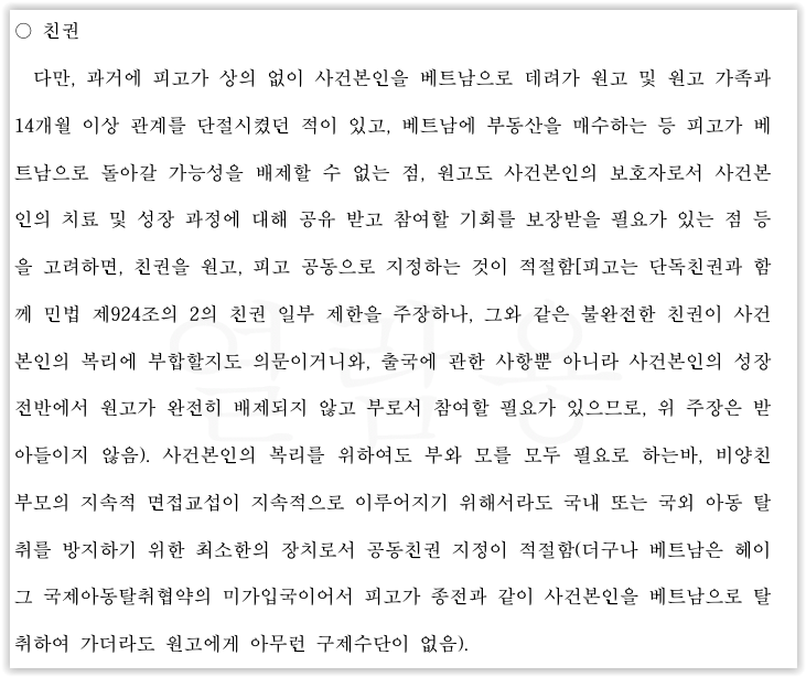 다만 재판부는 단독 양육권자로 피고를 지정하였으면서도, 통상의 경우와 다르게 원·피고를 공동친권자로 지정하였습니다. 베트남으로 가출한 이력이 있는 피고가 또다시 베트남으로 귀국할 경우, 사건본인의 복리가 저해될 수 있기 때문입니다.