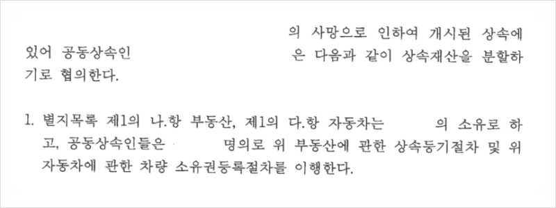 때문에 상속재산 분할에 관하여 상호 받아들일 만한 합의안이 도출되었다면, 협의로 사건을 신속히 해결하는 것이 바람직합니다. 협의로 진행할 경우 상속재산과 관련한 모든 내용은 공동상속인간 합의로 정해지므로 협의서는 매우 신중히 작성되어야 하므로, 협의서 작성 시 반드시 법률전문가의 조언을 구하시기 바랍니다.